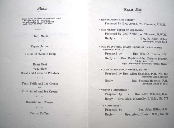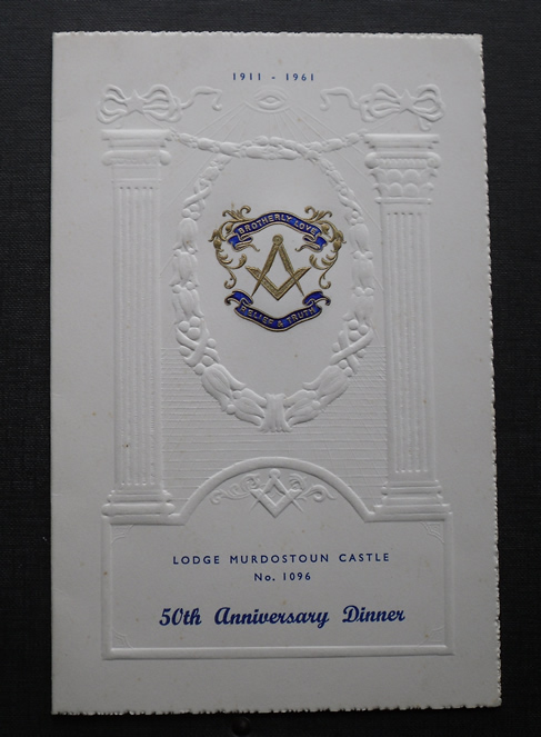The next two images are of the 50th Anniversary Dinner programme. Thanks to Bro John Strachan P.M. for unearthing this programme , the Consecration programme and the 75th Anniversary booklet from his personal archives.