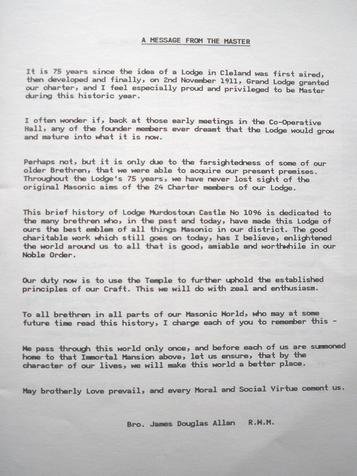 . . . . and from the inside page of the 75th Anniversary booklet, a message from the then RWM Bro J Douglas Allan - now sadly and suddenly gone to the Grand Lodge above. His message stands the test of the years and the last paragraph is as relevant today as it was when first written in November 1986.