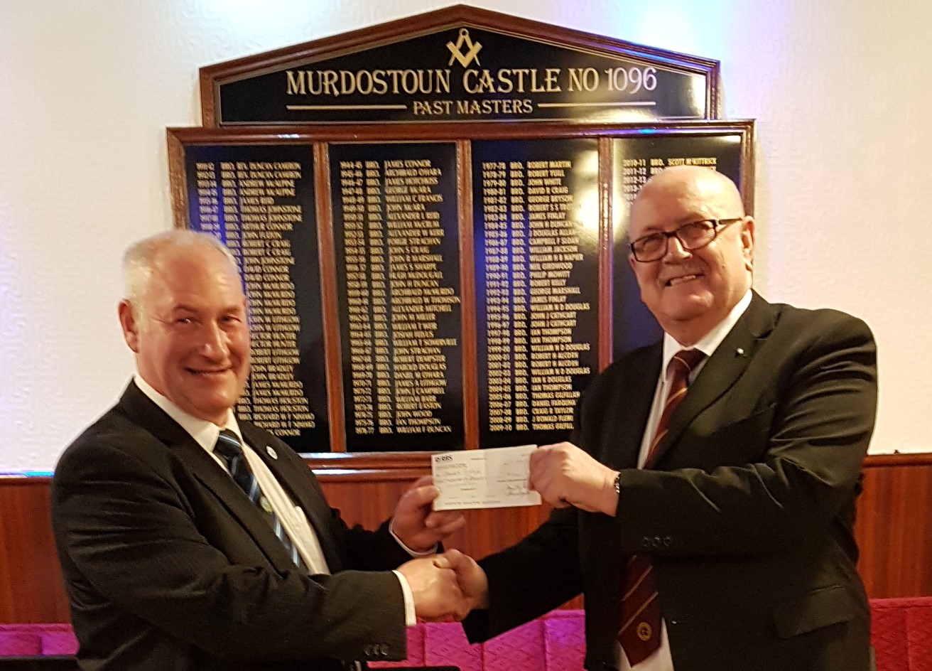 The following photo is of Bro Ian Douglas, Treasurer presenting Bro James Purdie with the cheque. If you look closely, you will see the wee tears just forming in Bro Treasurers eyes!!