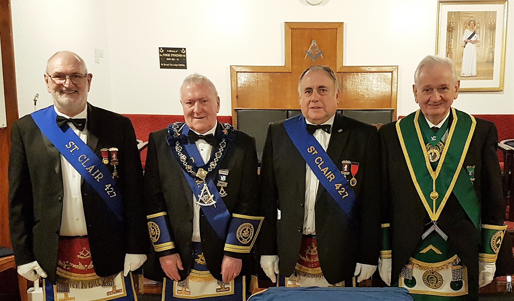 Left to right : RWIM Bro Ian Cleland, RWM Bro Ian Thompson, RWIM Bro Gary Gilfillan, SPGM Bro Angus Ross. Photo courtesy of Bro Jim Finlay PM.